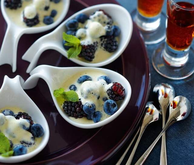 - To serve, pour the zabaglione over the berries evenly, garnish with mint, and serve immediately.