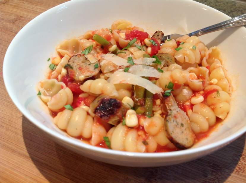 - To make the sauce, in a large, deep skillet over medium heat, heat the oil. Add the garlic and saute for 1 minute, making sure it does not burn. Add the green beans and saute for 2 minutes. Add the tomatoes and cook for 5 minutes, stirring occasionally, until some of the liquid has evaporated. Use a potato masher to crush the tomatoes. Add the corn and cook for 2 minutes. Add the basil, parsley, salt and pepper and taste for seasoning. Add the sausages to the sauce and taste again for seasoning.
