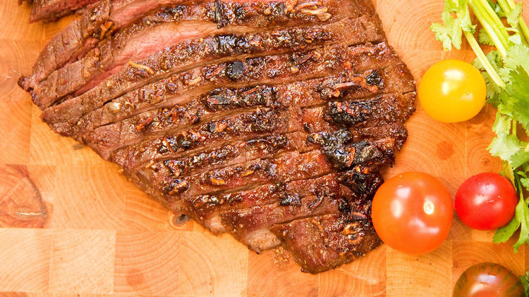 5. Carve across the grain into thin slices and serve immediately. Spoon some juices over the meat.